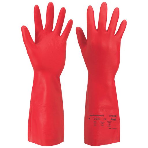 0,425 mm vastag nitrilből készült piros kesztyű, belül velúrkikészítéssel, a tenyéren és az ujjakon textúrált felülettel. Teljes hossza: 38 cm. Egyenként vetik alá a tömítettségi vizsgálatnak.