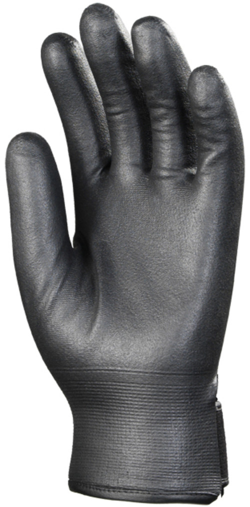 Fekete, varrás nélküli poliamiddal erősített 15-ös kötésű kesztyű teljesen mártva fekete puha nitrillel.