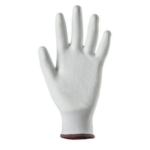 Fehér, varrás nélküli, poliészterrel erősített, 13-mas kötésű kesztyű, fehér poliuretánnal mártott tenyérrel és kötött mandzsettával.