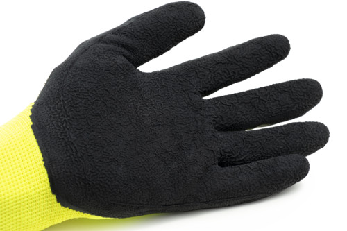 Fluo sárga, varrás nélküli, 13-as kötésű poliamid elasztán kesztyű, tenyerén dupla latex bevonat: fekete habosított latex mártás sandy csúszásbiztos felülettel, kötött mandzsetta
