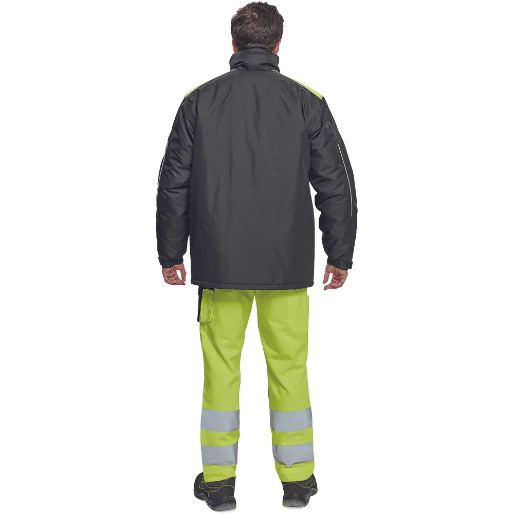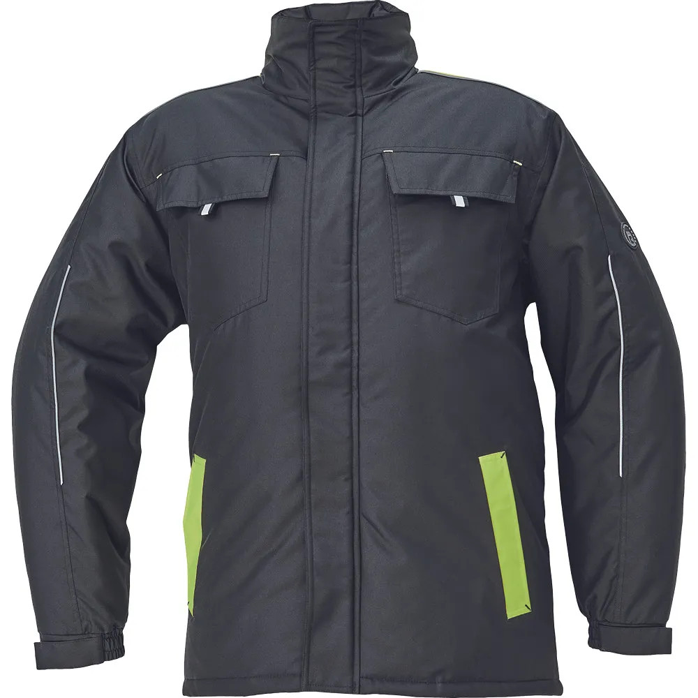 • férfi téli kabát • tépőzáras takarópánttal fedett cipzár • 2 oldalsó zseb, 2 mellzseb • 1 belső mobiltelefonzseb • rugalmas mandzsetta tépőzárral • fényvisszavető szegés