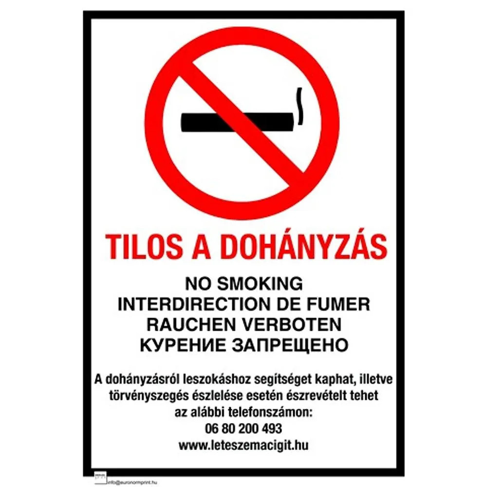 Dohányozni tilos, 4 nyelvű, ANTSZ és Korm. rendelet alapján - tábla 210x297