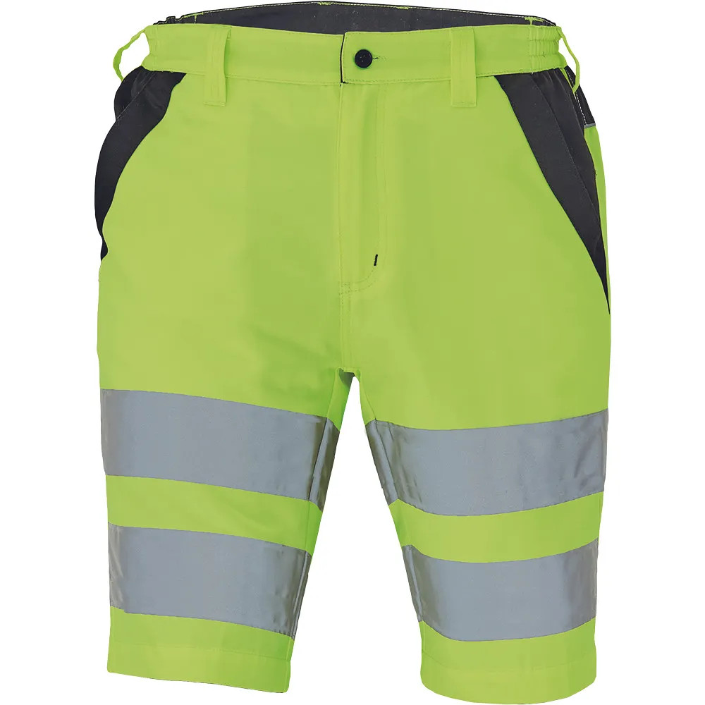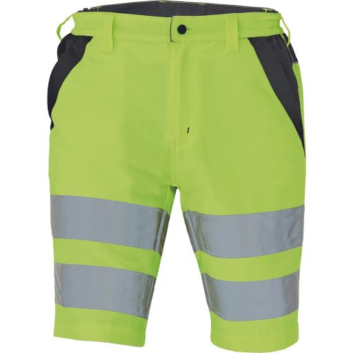 • férfi HI-VIS rövidnadrág rugalmas derékkal; 2 első zseb, 2 hátsó zseb; két 7 cm-es nyomtatott fényvisszavető csík a comb körül; fényvisszavető szegés