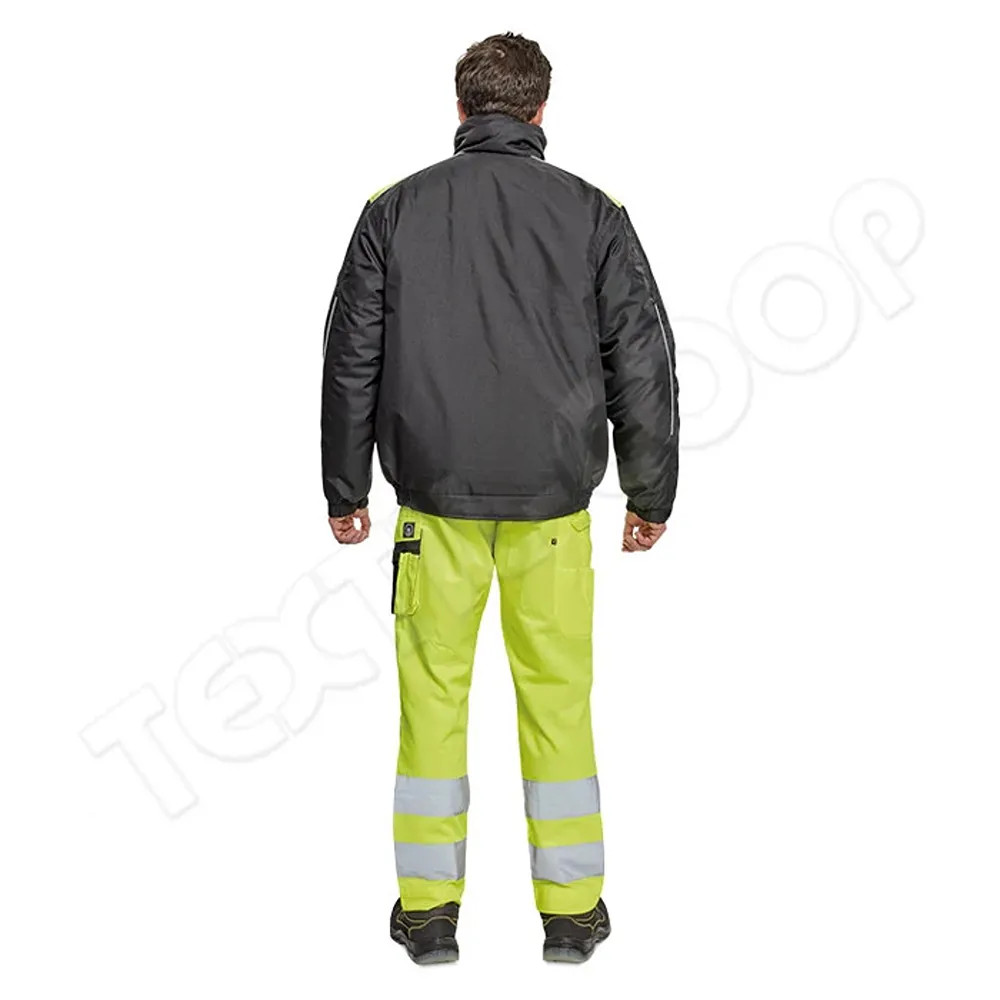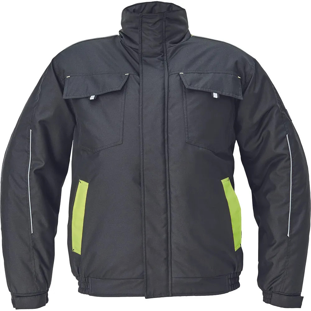 • férfi téli pilóta dzseki; rugalmas derék; tépőzáras takarópánttal fedett cipzár; 2 oldalsó zseb, 2 mellzseb; 1 belső mobiltelefonzseb; rugalmas mandzsetta tépőzárral; fényvisszavető szegés