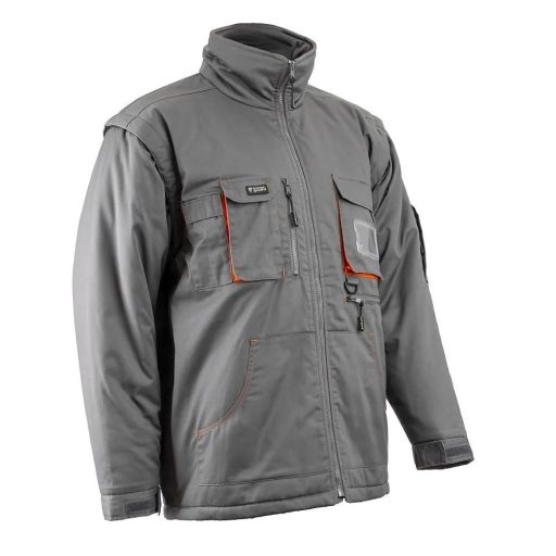szürke kabát narancs színű kontraszt betétekkel