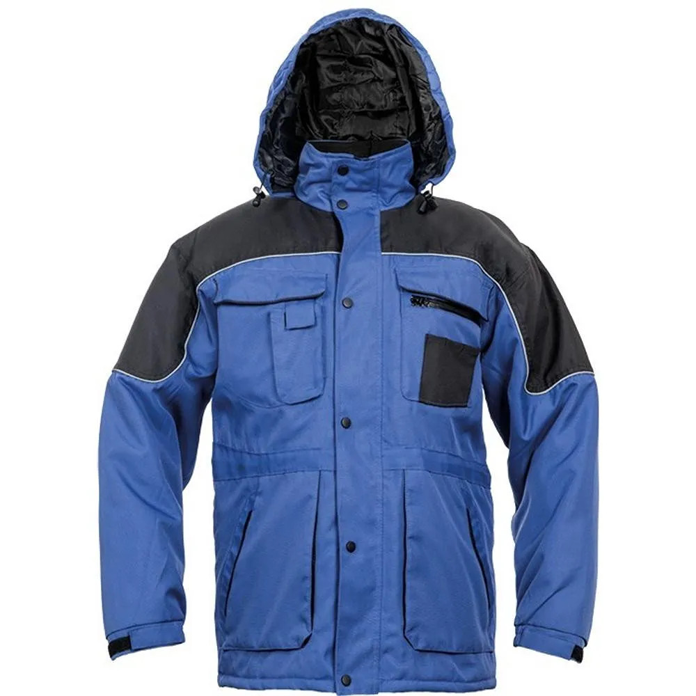 Meleg bélésű, vízhatlan dzseki gallérba rejtett kapucnival.