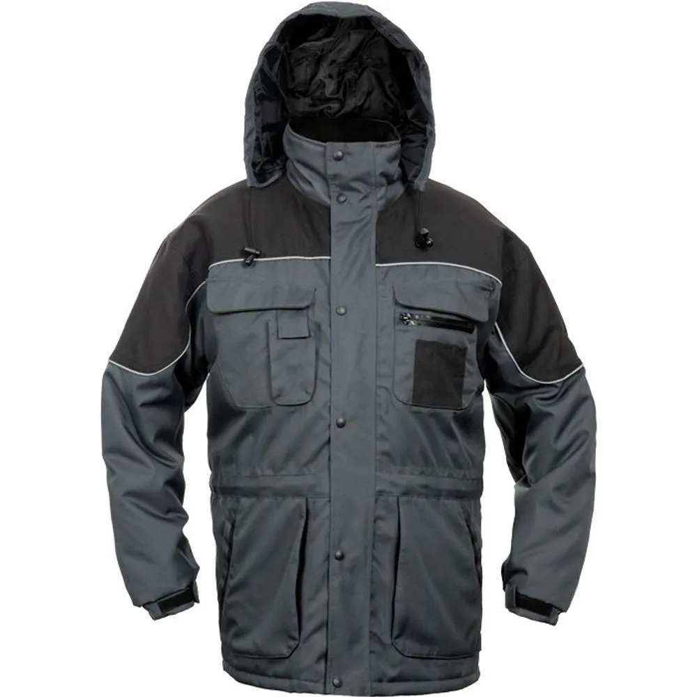 Meleg bélésű, vízhatlan dzseki gallérba rejtett kapucnival.
